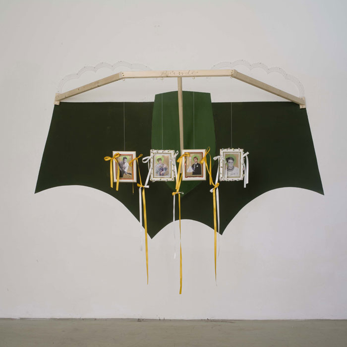 ![]() Installation „Bürde“, Holzbalken, gerahmte, übermalte Fotografien, Deckchen, Wandapplikation, 2008, Diplom Hauptfach, Hochschule für Gestaltung, Offenbach am Main |