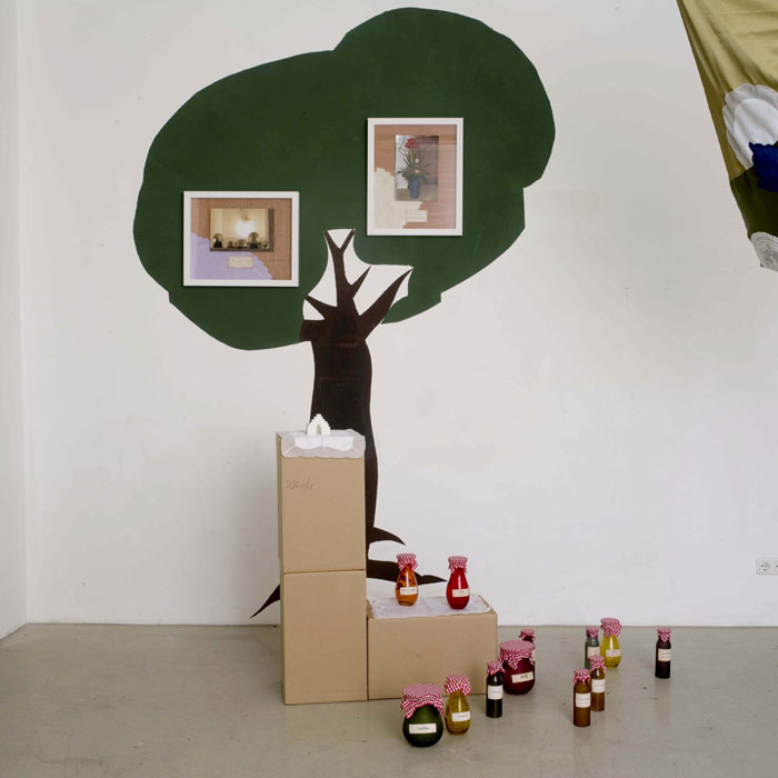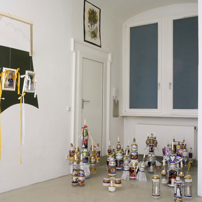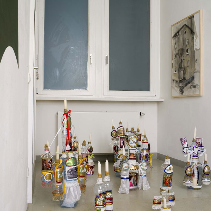 ![]() Installation „Würde“, Wandapplikation, gerahmte Collagen, Glasobjekte, Kartons, Deckchen, Zuckerhaus, Anschnitt „Kinderdecke“, 2008, Diplom Hauptfach, Hochschule für Gestaltung, Offenbach am Main |