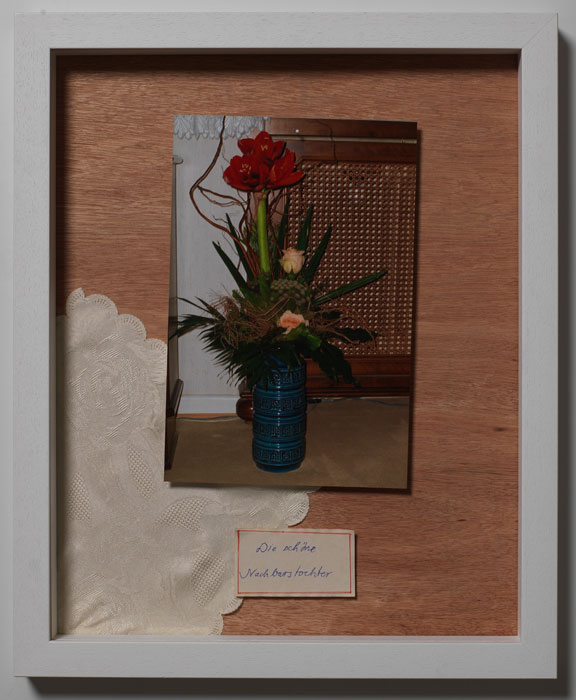 ![]() „Die schöne Nachbarstochter“, Collage (Holz/ Tischdecke/ Papierschild/ Fotografie), 2010, 50 cm x 70 cm, 1 von 25 |