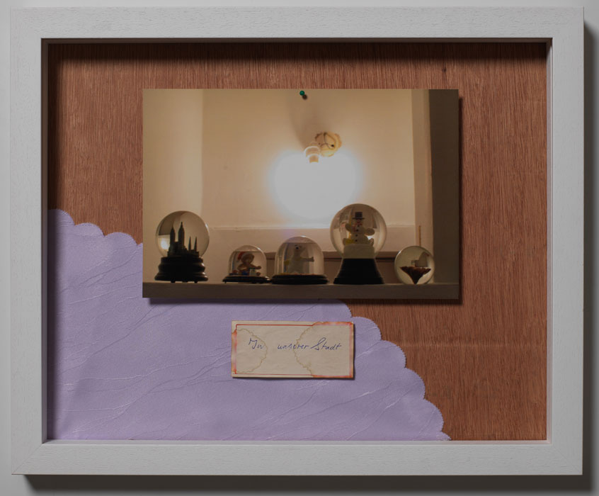![]() „In unserer Stadt“, Collage (Holz/ Tischdecke/ Papierschild/ Fotografie), 2010, 50 cm x 70 cm, 2 von 25 |