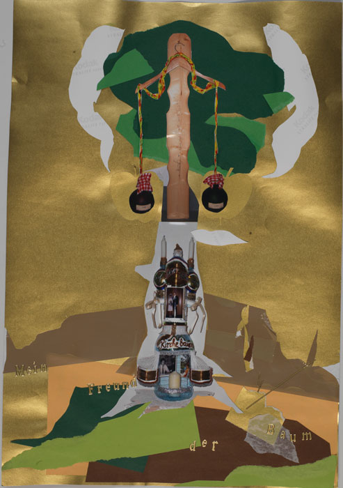 ![]() „Mein Freund der Baum“ (KONNOTATIONEN: Auf dem Balken „Selig sind die Armen im Geiste“; auf den Flaschen „Liebe“ und „Haß“; auf dem Objekt „Auf diesen Felsen werde ich meine Kirche bauen“), Collage (diverse Papiere, Foto, Klebeband, Klebebuchstaben), 2010, 35 x 45 cm, 1 von 10 |