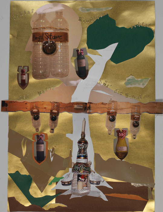 ![]() „Angst essen Seele auf“ (KONNOTATIONEN: Auf den Flaschen „Angststarre“; Flaschen auf dem Balken „Scham, Zorn, Trauer, Wut“; Flaschen unterhalb des Balkens: „Wollust“, „Hochmut“, „Neid“, „Geiz“; auf dem Objekt „Geschenke der Hoffnung“), Collage (diverse Papiere, Foto, Klebeband, Klebebuchstaben), 2010, 35 x 45 cm, 1 von 10 |