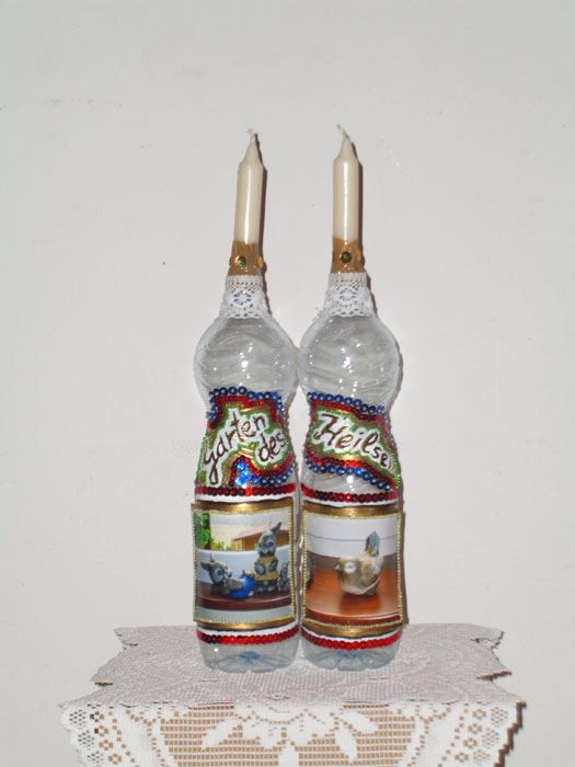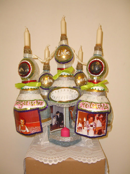 ![]() „Wahre Liebe wartet/ energetischer Heilsschlaf“,Objekt, 2006, Höhe ca. 70 cm, Plastik/ Stoff/ Foto/ Pailletten u.ä./ Gold/ Tusche/ Kerzen, 12 von 25 |