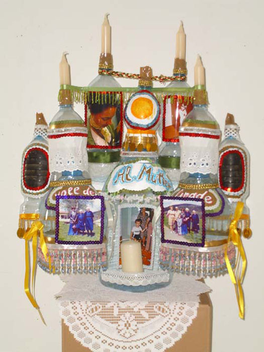 ![]() „Geschenke der Hoffnung“, Objekt, 2006, Höhe ca. 70 cm, Plastik/ Stoff/ Foto/ Pailletten u.ä./ Gold/ Tusche/ Kerze, 6 von 25 |