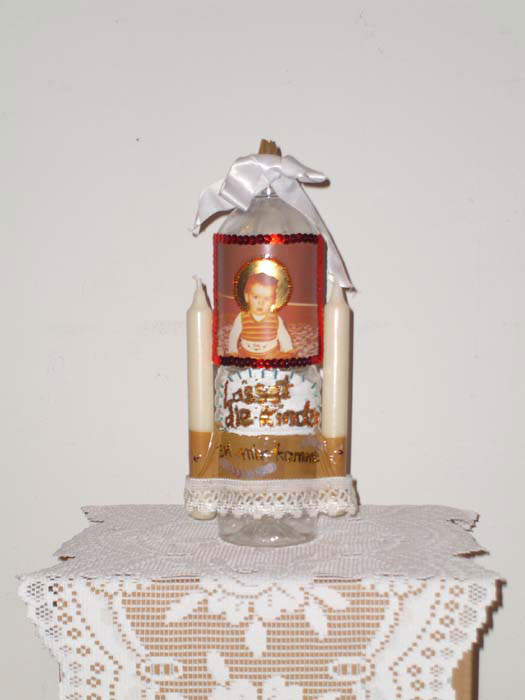 ![]() „Lasset die Kinder zu mir kommen“, Objekt, 2006, Höhe ca. 40 cm, Plastik/ Stoff/ Foto/ Pailletten u.ä./ Gold/ Tusche/ Kerzen, 11 von 25 |