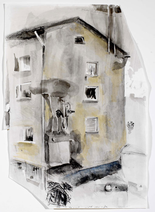 ![]() „Ecke Haus Gundwaldstraße/ Boiler- Rohre“, Zeichnung, 2004, 70 x 100 cm, Tusche/ Bleistift/ Aquarell/ Lithokreide/ Abrisse des Papiers/ Frottage/ Notizen, 1 von 65 |