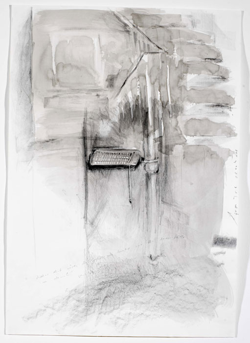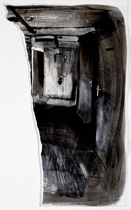 ![]() „Kellergang zur Waschmaschine“, Zeichnung, 2004, 70 x 100 cm (unregelmäßig, gerissen), Tusche/ Bleistitft/ Lithokreide/ Acrylfarbe (weiß)/ Abrisse des Papiers/ Notizen, 3 von 65 |