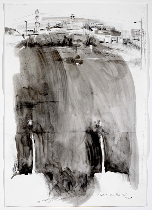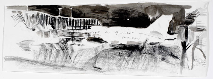 ![]() „Blick zum Flughafen/ Flakstellungen“, Zeichnung, 2004, 70 x 100 cm, Tusche/ Bleistift/ Papierknicke und – abrisse/ Aquarell/ Notizen, 4 von 65 |