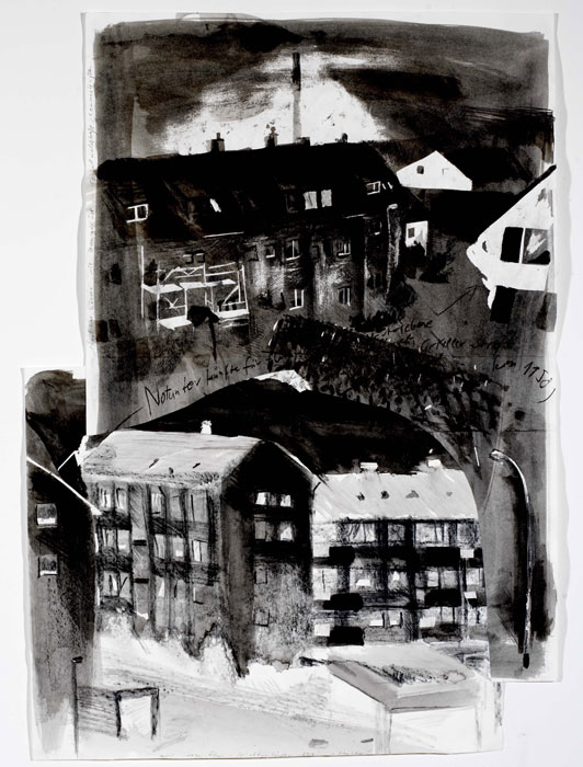 ![]() „Nachbarhäuser/ Lönsstraße“, Zeichnung, 2003, 70 x 100 cm, Papiercollage/ Abkratzungen/ Tusche/ Bleistift/ Lithokreide/ Acrylfarbe (weiß)/ Notizen, 8 von 65 |