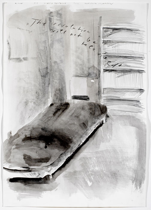![]() „Bett/ ´Revolution will not be televised´“, Zeichnung, 2003, 70 x 100 cm, Tusche/ Bleistift/ Papierrisse/ Notizen, 7 von 65 |