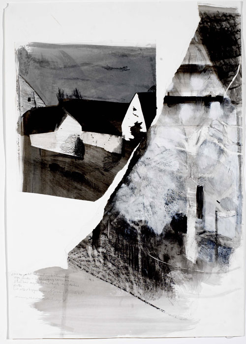 ![]() „Reihenhäuser/ Scheunenviertel gegenüber“, Zeichnung, 2004, 140 x 100 cm (unregelmäßig), Tusche/ Bleistift/ Lithokreide/ Papierabtragungen und – abrisse/ Notizen, 5 von 65 |