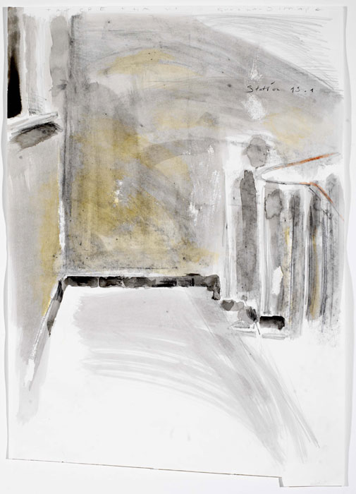 ![]() „Treppenhaus Gundwaldstraße/ Station 13.1“, Zeichnung, 2004, 70 x 100 cm (unregelmäßig), Tusche/ Bleistift/ Aquarell/ Papierrisse/ Notizen, 9 von 65 |