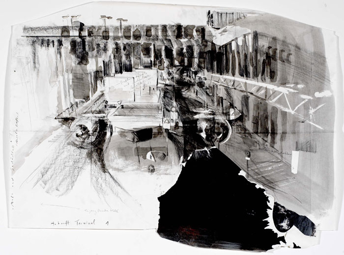 ![]() „Ankunft Terminal 1/ ´Mohn und Gedächtnis´“, Zeichnung, 2004, 100 x 70 cm (unregelmäßig), Tusche/ Bleistift/ Collage/ Papierabtragungen und – risse/ Notizen, 10 von 65 |